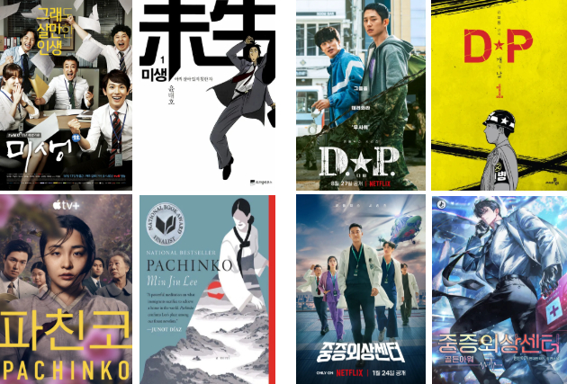 사진 맨 위 왼쪽부터 시계 방향으로 tvN 드라마 <미생>, 넷플릭스 시리즈 <D.P.>, 넷플릭스 시리즈 <중증외상센터>, Apple TV+ 시리즈 <파친코>, 그리고 각 콘텐츠의 원작인 웹툰, 웹소설, 소설 이미지. |